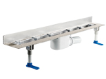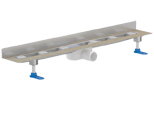 Особено нисък неръждаем душ-канал без капак, за монтаж до стената, ДЪЛБОЧИНА САМО 68 мм. Състои се от тяло на канала с винкелна част за стената, опесъчен фланец за свързване към алтернативната хидроизолация на пода, сифон от РР * DN50, странично оттичане и изваждащ се воден затвор дълбок 24 мм (ВНИМАНИЕ не съответства на нормите). Тялото на канала притежава самопочистващ ефект, заради вградените наклони. Дебит 0,46 l/sek. 2 броя шумоизолиращи монтажни крака за настройка по височина, 2 бр. монтажни подпори с винтове за стената, дюбели и шумоизолация бутилова лента, 2 бр. клеми за рамката и предпазител при монтажа. Монтажна дължина 1000 мм