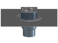 Подов сифон, DN50/75/110, долно оттичане, фланец за хидроизолацията, суха клапа против миризми, наставка с променяема височина 12-70 мм и рамка 123 х 123 мм, решетка 115 х 115 мм от неръждаема стомана и полирана.