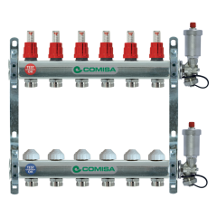 Колектор 1" Ж/Ж с разходомер, автоматичен обезвъздушител и дренаж – 6 отвора, неръждаем