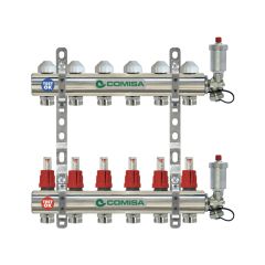 Колектор 1" Ж/Ж с разходомер, автоматичен обезвъздушител и дренаж – 5 отвора, неръждаем