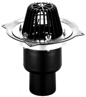 Воронка за плосък покрив DN110, долно оттичане, с термоизолирано тяло, фланец за хидроизолацията, пръстен от неръждаема стомана за притискане на мембраната, листоуловител d 180мм с UV защита.Защитната капачка при монтажа се съдържа в опаковката