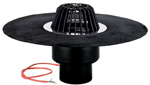 Воронка за плосък покрив DN110, долно оттичане, с термоизолирано тяло, вграден нагревател * саморегулиращ се (10 * 30 W), за директно свързване към мрежа 220V, със заводски заварена SBS битумна мембрана d 500мм за идеалното свързване с битумни хидроизолации, листоуловител d 180мм с UV защита.Защитната капачка при монтажа се съдържа в опаковката.