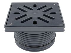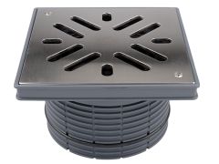 PERFEKT-подов сифон DN160, долно оттичане, фланец за хидроизолацията(но без гарнитура), с пластмасова наставка с променяема височина 42-130 мм, с пластмасова рамка 240 х 240 мм, решетка от неръждаема стомана (CrNi 18/10) 226 х 226 мм с винтове, пясъкоуловител и воден затвор.