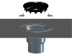 Наcтавка DN 110 мм с рамка от неръждаема стомана (V2A) 121x121 мм и решетка от неръждаема стомана 115x115 мм, с винтове. Обща височина 100 мм, височина на рамката 6 мм. Защитния капак при монтажа се съдържа в опаковката.